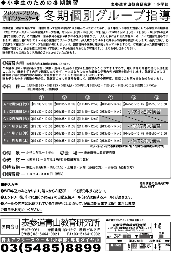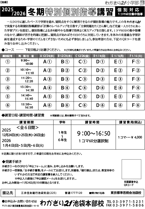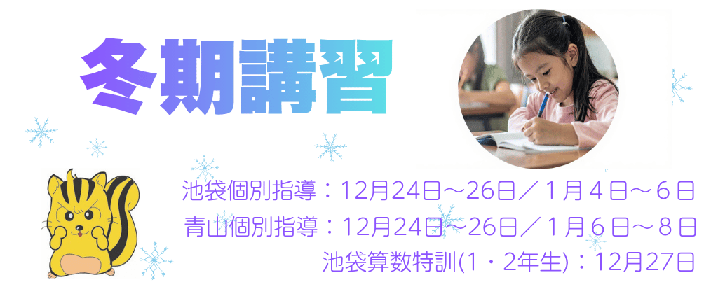 わかぎり21小学部では、池袋本部校・表参道青山校各校で冬期講習を実施します。この講習では最大4名までを1クラスとして、個々の課題を明らかにし、不安なく新学年を迎えていただくための集中学習を行います。専用テキストの他、教材の持ち込みも可能です。受講前に保護者様と担当が面談をして、内容や時間等を相談の上決定することも可能です。まずはお気軽にお問合せください。