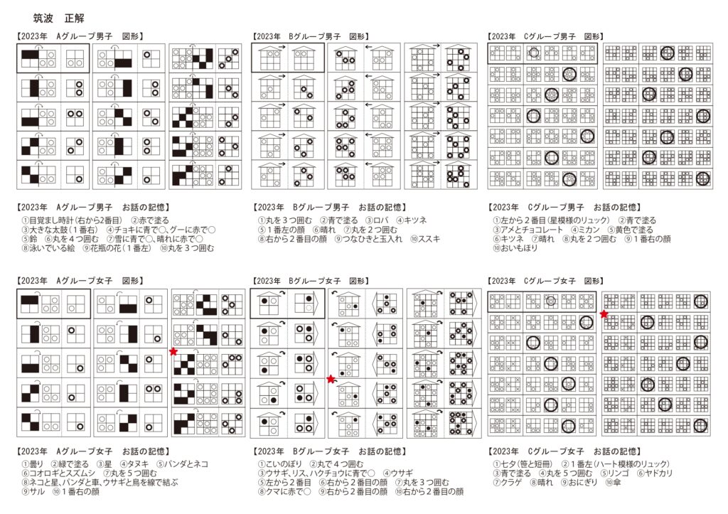 正解プリント訂正2023年女子の正解に誤りがありました。お詫びして訂正させていただきます。★が誤りを修正した箇所です。※11月27日以降購入の方は修正済です。2024■お話の記憶 本文音声Aグループ男子Aグループ女子Bグループ男子Bグループ女子Cグループ男子Cグループ女子■図形 出題動画Aグループ男子Aグループ女子Bグループ男子Bグループ女子Cグループ男子Cグループ女子2023■お話の記憶 本文再生Aグループ男子Aグループ女子Bグループ男子Bグループ女子Cグループ男子Cグループ女子■図形 出題動画Aグループ男子Aグループ女子Bグループ男子Bグループ女子Cグループ男子Cグループ女子