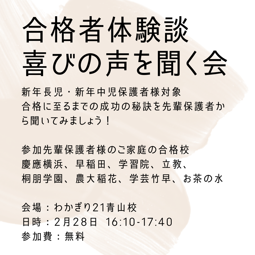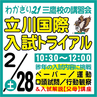 小学校・幼稚園受験を目前に控えた保護者と本人を対象に「志望校別模擬面接」を実施します。 入試における面接の重要性については十分ご承知のことと思いますが、 例年この模擬面接では、本番さながらの雰囲気の中で、合格に向けて最後のリハーサルを行い、 本校から数多くの合格者を輩出する一因となっています。 面接実施校・園をご希望の方は奮って参加し、自信を持って本番に臨めるようにしてください。 なお志望小学校・幼稚園によって両親面接の場合はご両親、親子面接の場合は保護者と本人でお越しください。